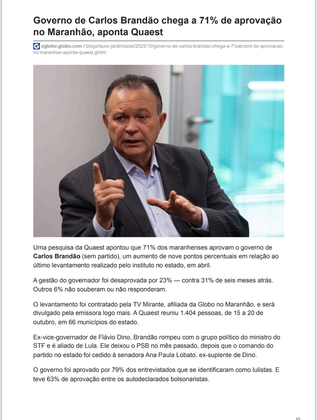 O levantamento foi contratado pela TV Mirante, afiliada da Globo no Maranhão, e será divulgado pela emissora logo mais. A Quaest reuniu 1.404 pessoas, de 15 a 20 de outubro, em 66 municípios do estado.
