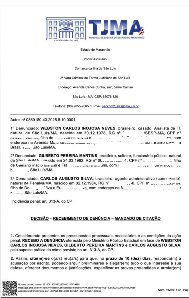 A denúncia foi recebida pela juíza Lidiane Melo de Souza, da 2ª Vara Criminal de São Luís, em decisão assinada no dia 6 de outubro de 2025. O documento determinou a citação formal dos acusados e destacou que há provas suficientes para abertura da ação penal.